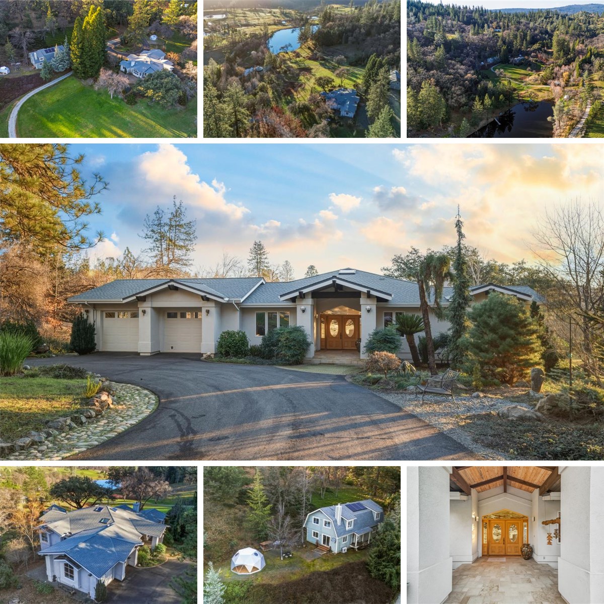 Magical, private, and truly ONE OF A KIND, this extraordinary gated estate offers 30 serene acres with a stunning pond, owned solar, comfortable main residence w/2-car garage, ADU w/2-car garage, yurt, geo-domes, abundant trail system, and multiple additional outbuildings - all thoughtfully positioned and hidden from view - creating an unmatched opportunity for multi-generational living, retreat potential, or private estate lifestyle. From the moment you enter through the private gate, a sense of calm and possibility surrounds you. The picturesque drive opens to a breathtaking pond reflecting sky and trees, setting the tone for this peaceful and inspiring property. The main home is warm, open, and filled with natural light, designed for comfortable living and effortless entertaining. Expansive windows capture sweeping water and land views while maintaining privacy. The thoughtful floor plan offers excellent flow, and the attached three-car garage provides everyday convenience. The private ADU features two bedrooms, 1 full & 1 half bath, ideal for guests, extended family, rental income, or caretaker housing, and also offers its own attached two-car garage, workshop, office space, with an additional flexible upper level perfect for an art studio, gym, crafting space, or storage. Outdoor amenities make this property truly exceptional. The large pond with private dock allows for kayaking and paddle activities at home. A high-quality yurt overlooks two ponds, creating a tranquil space for yoga, meditation, or guest retreat use. Unique geo-domes and an aerial arts space near the water add architectural character and creative flexibility. Formerly owned by a landscape designer, the grounds are thoughtfully developed and highly functional, featuring a tractor shed, greenhouses, wood shed, established orchard producing fresh fruit and berries, plus additional utility and storage structures, all positioned for privacy and minimal visual impact. An abundant trail system weaves throughout the acreage, offering endless opportunities for recreation, quiet reflection, and immersive connection to the natural beauty surrounding you. Located in a desirable private setting while remaining convenient to town, Rollins Lake, and major commuter routes, and approximately one hour to both Sacramento and Truckee. This property offers the rare combination of privacy, functionality, and accessibility. This is more than a home, it's a private sanctuary offering space to live & thrive!